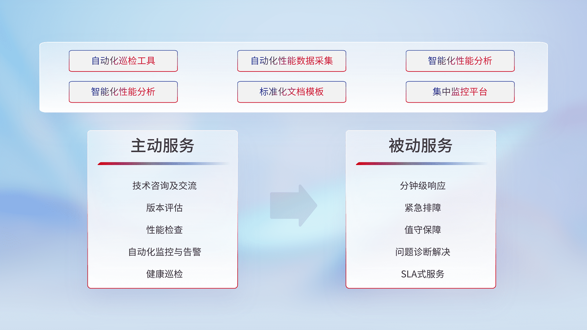 智能化工具和标准化文档,,,,保障服务质量,,提供主动服务(包含技术咨询、、、版本评估、、、性能检查、、自动化监控与告警、、、健康巡检)和被动服务包含(分钟级响应、、、、紧急排障、、、、值守保障、、、、问题诊断解决、、、SLA服务)。。。。